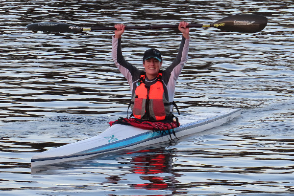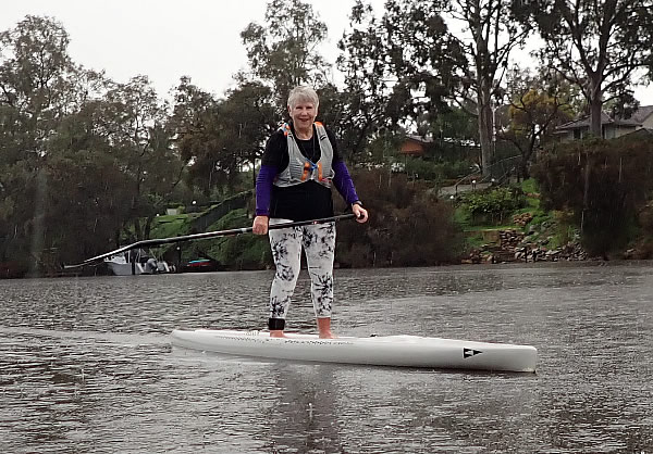 Penny Bates a kayak paddler, surfer, board paddler and long time member of Ascot Kayak Club relishing her paddle in the rain.