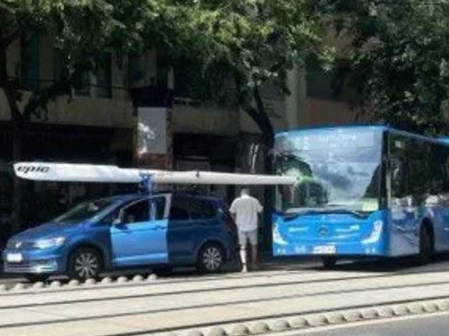 Oops. Epic kayak vs Budapest city bus. Is your ski overhanging too far? Would a flag may have helped to avoid this collision?