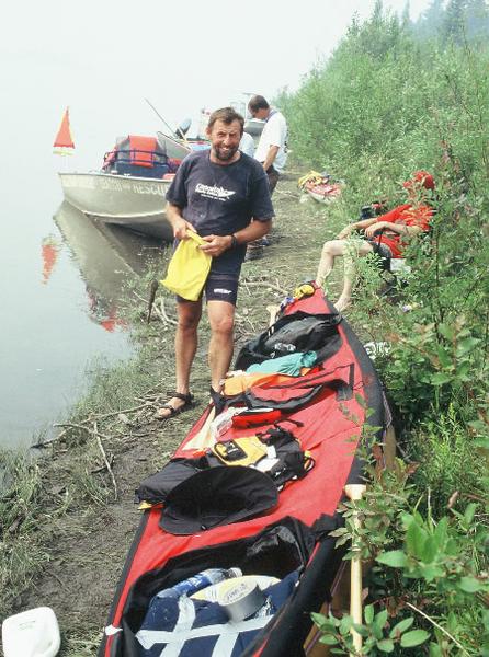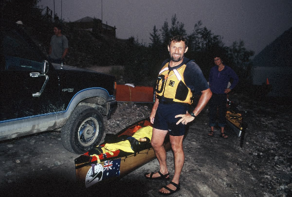 monitoring the fire, was a welcome visitor as we had seen little of civilisation along the way. We were now about sixty kilometres from the nearest road but to get there, there were several mountains to cross. In an emergency the river was still the quickest and safest way out. As we headed straight north we caught up to Joe again. He looked pretty uncomfortable in his kayak. He would