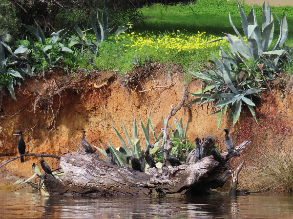 birds. Hundreds of Little Black Cormorants were perched in the trees. Many flew downstream as I passed and landed further down to fly off again. A White Faced Heron and a Pied Cormorant stayed still as I took a photo near the Fishmarket Reserve cliffs. Birds were everywhere. There seemed to be nearly every river bird on the corner of Fishmarket Reserve. Little Black Cormorants