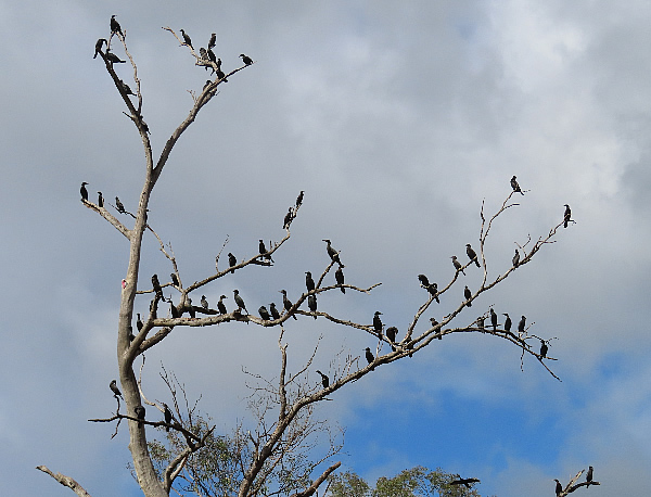 Little Black Cormorants were perched in the trees and many flew off as I paddled by.