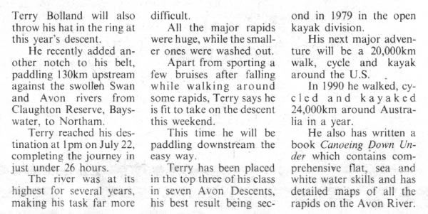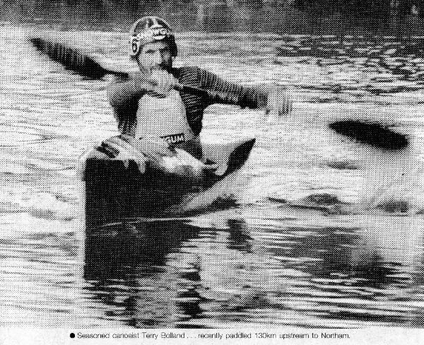 hard to get out and get back into the river. Trees and bushes were a real problem, one slip and I could have been wrapped around them. I was in my Wild Water kayak with a small cockpit which made it that more difficult when I had to exit the boat amongst the trees and debris along the river bank. I paddled alone with Tim Fry as my support team and meeting me at the top end of the Avon Valley to camp. It took me 26 hours, reaching my destination, Northam at 1.00pm on the 3rd day. Then a day or two later I paddled back to Bayswater in the