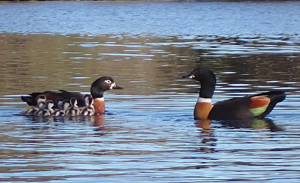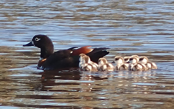 their young and for about a kilometre I saw nothing until I came across a pelican, a Pied Cormorant and 2 White Faced Herons. I thought I must have missed the Shelducks but lucky for me I caught up with them near a creek entrance just upstream of Sandy Beach on the east side of the river. They were being harassed by a Raven. Young ducklings like these, the first I had seen this season are in danger of being