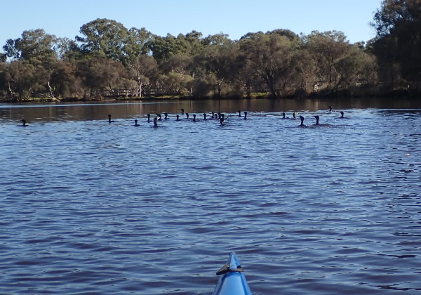 times overbalancing to a point I nearly capsized, but luckily I didn’t. They walked along the bank and in the grasses and one looked as if it was sitting on a nest that didn’t appear to be there. Swamphens are always good to watch. I left them and headed towards Sandy Beach corner coming across a lone Australasian Grebe. Grebes just don’t like being photographs and as soon as I got close it would dive and come up several metres from where it went under water. Although there were more birds along the next kilometre I had taken that many photos I didn’t need to take any more. That was until I reached Ascot Kayak Club where there were a group of Little Black Cormorants feeding. I couldn’t help but take another photo. My 15 km paddle had taken me
