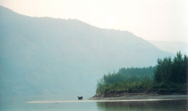 adrenalin started to pump, I became strong and powerful and my paddle rating lifted as I just wanted to charge down the river. The noise came closer and suddenly a helicopter appeared out of the smoke haze. The haze had lifted enough to allow us to see smoke and flames rising from several places along the river and to our south on the Dawson Range. The chopper, which was probably