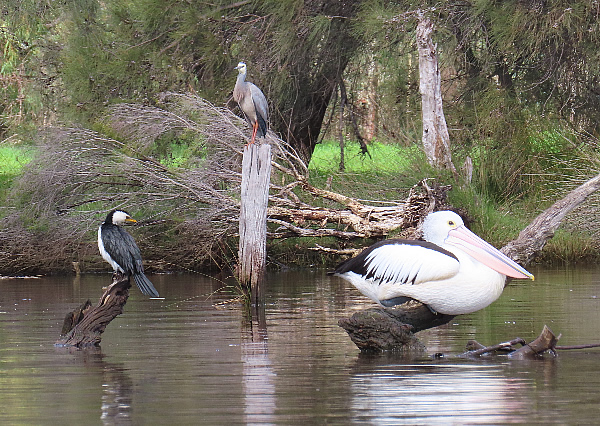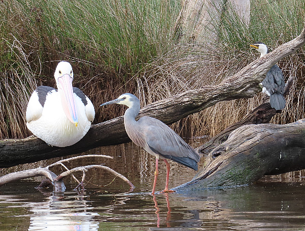 A Pelican, a White Faced Heron and a Little Pied Cormorant.