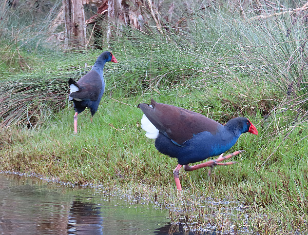 picked off by Ospreys, Kites and Ravens so I am not sure that I would see as many ducklings next time I come across this family. A few metres up the creek 3 Purple Swamphens were mingling amongst the grasses on the side of the creek. I eased into the creek carefully and silently trying not to scare them away, at least not before I took some photos. I sat there camera in hand and at