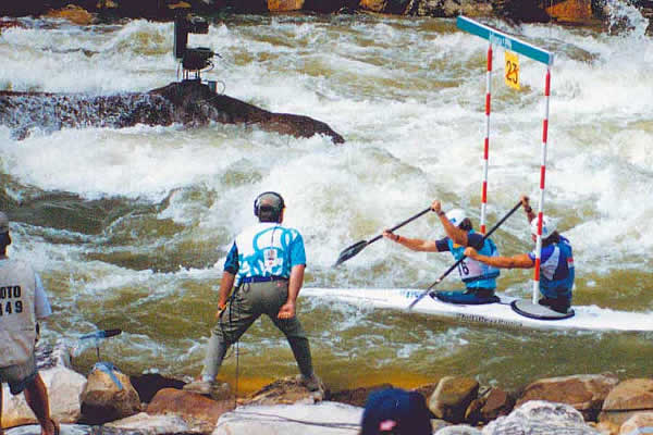 races. Kayak and canoe whitewater slalom is where athletes use two types of boats: canoes or kayaks. In the canoe events, paddlers kneel with a single blade paddle. In the 1996 Olympics, the canoe