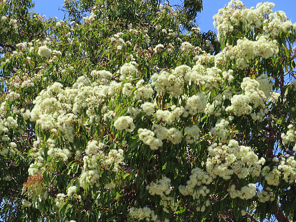 A closer look at a tree in front of our balcony, 2018 - A rare mass blossoming of Western Australia's native marri tree has bees and their keepers jumping for joy as the colourful tree-top display