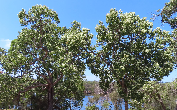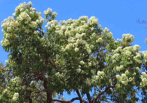 quantities of an oil which consists mainly of terpene and is of no commercial value. Marri is usually a large tree to 40 metres but can take mallee form on poor sites. It bursts into prominent cream flowers, held outside the canopy, in mid-summer – despite this being in the middle of a rainless period in the mediterranean climate of its native habitat. The bark is rough (tessellated),