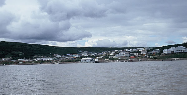 feet wet I didn’t get out of the canoe, instead I stood up and peed in a bottle, a much easier task when the canoe wasn’t moving! As we took off, the river narrowed and quickened. We were all enthused, there was movement in the water and the canoe was picking up the pace. We flew by the picturesque Pitkas Point village which was on the edge of a massive area of barren hills. The