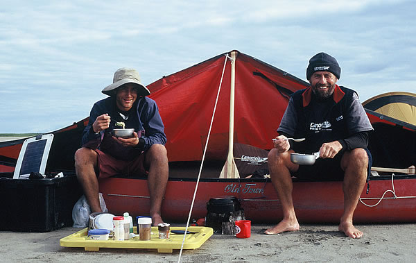 day’s end we had paddled a further 23kms and landed on a sandbar slightly before and across from Tunupokap Channel. It was another good camp spot with views of the distant hills and due to a lagoon next to us, water was on both sides. We ate our dinner in the shelter of our large spray deck that Ed had tied up in the centre of the canoe to stop the cold wind from blowing on us. Just as we finished off the last of the fish, a boat stopped to find out whether we were okay. We had a quick chat and