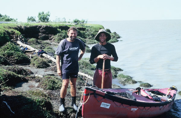 broadside which made paddling difficult, but we didn’t care, we were nearly at Emmonak, which was situated a few hundred metres down a channel that forked off from the main river. From afar we guessed where the channel entrance should be, but on closer inspection we saw nothing. The river banks blended into one, making it difficult to distinguish a narrow waterway, but it just had to be there. Although confident that we were headed in the right direction I began to doubt my own navigation. Then