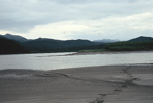 metre high thick layer of decaying wood and mud sandwiched together. Obviously this was years of material that had built up. Further upstream the green vegetation was dense and a haven for mosquitoes and hiding bears. I kept a close eye out for any movement and slapped the mosquitoes as I filled the water containers. I was pretty penned in with no quick way of escaping. When my containers were full I climbed carefully back up the slope to where Ed was waiting and returned to the canoe for lunch.