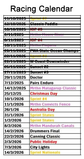 Distance 13km. Start Middle Swan Bridge, downstream right of Ron Courtney Island, left turn round spit post near boat ramp before Tonkin bridge, back up stream, Island on left, finish at Ascot jetty. Pairs go off together at 1 min intervals, from slowest to fastest. Work as teams, take turns to wash ride each other for