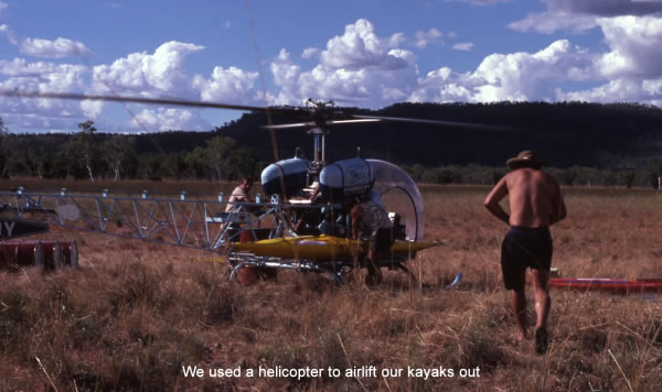 That left Tarquin, Andrew and myself to do the long drive back to Carson Station and then to Boomerang Yard where two helicopters, although one broke down, were mustering cattle. When the helicopter was free we were able to hire it to collect our kayaks as it was the only way to recover them. With there being no track it was impossible to drive and too hard to walk. Tarquin jumped in and the pilot took off and within 70