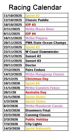 * All racers must have PFD, Phone and Leg Leash. Please have these sighted on check
