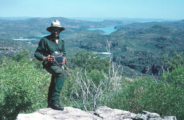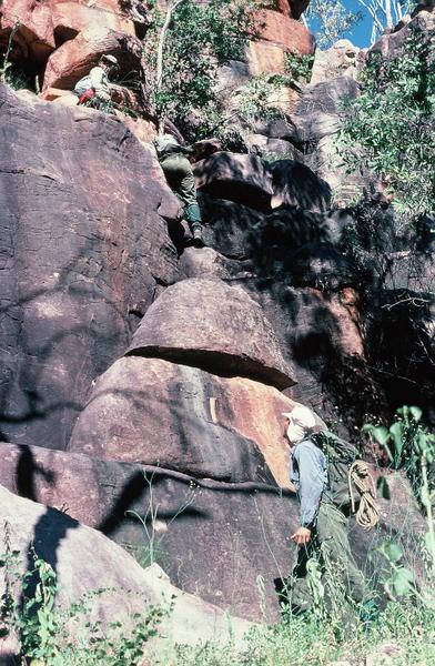 laden rocks and steep muddy banks. It looked an evil place and as our memories lingered back to croc attack nearly 3 weeks previously, we shunted nervously towards a barrage of muddy boulders ladened with razor sharp oysters. Stranded by the low tide, we faced a three hour struggle to hoist our gear to the top of the cliff, to where eventually Dennis and Duncan greeted us with champagne to celebrate our safe arrival. Our celebrations were short however, for the following day all the canoeing equipment had to be cleaned and packed away and our walking gear and rations prepared. The Wilderness couple Mike and Susan Cusak kept in regular contact on the Flying Doctor radio and that evening we talked to Dick Smith who had helped us with $500.00 sponsorship. Dick had been to Mitchell Falls by helicopter the previous day.
