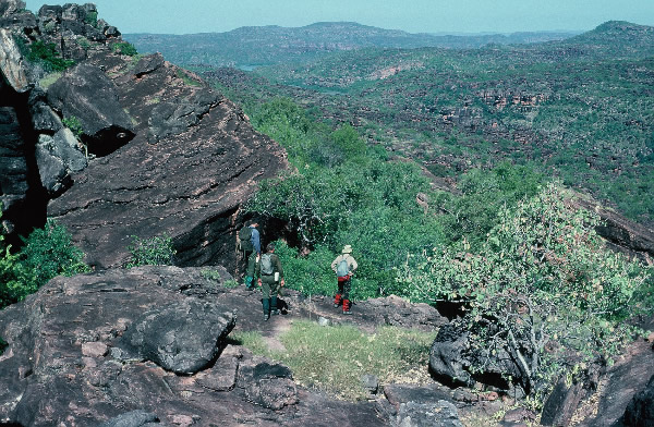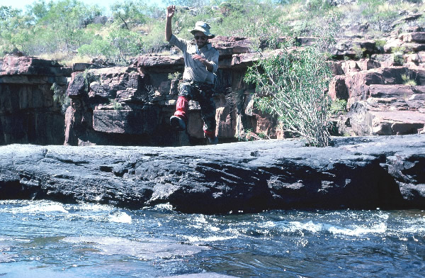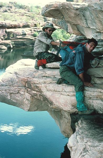 we headed towards an unnamed waterfall on the Hunter River we were forced to criss-cross many ravines, climb sandstone outcrops and fight our way through stabbing chest deep spinifex that oozed sticky resin on our clothes. It was a back packers nightmare and as the shadows grew longer, Dennis and Duncan descended a rock face into a carpet of spinifex below. Ewen, exhausted and still recovering from an oyster slash on his toe, tripped on a vine and fell head first down a two metre drop. Pinned