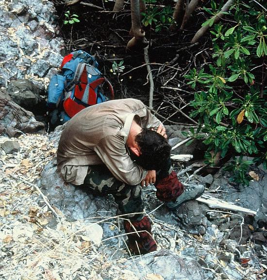 It was extremely hot, extremely hard pushing through high spinifex, and scrambling over large boulders. Ewen was often shattered at the end of the day.
