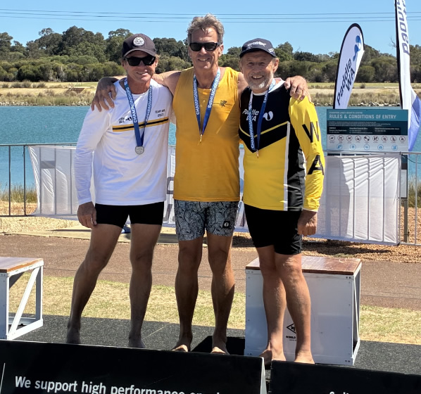 Phil, Dave & I. 65+ K1. I won 3 gold in the 75+ C1. (I was the only master). 1 gold in the 200 m 75+ K1, a silver in the 1000 m 65+ K1 and a bronze in the 65+ 500 m K1. Photo Ron Clarke.