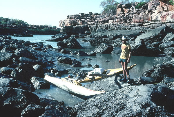 The end of our kayaking journey at Crystal Creek on the Mitchell Plateau. The tide left us high and dry. The slippery oyster laden rocks made it very difficult for us to