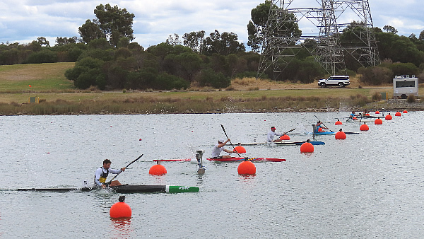 The start of the 500 metre race. The plop of water at the bow of the kayak is the gate going down as the race is started. Photo Lawrence Greed.