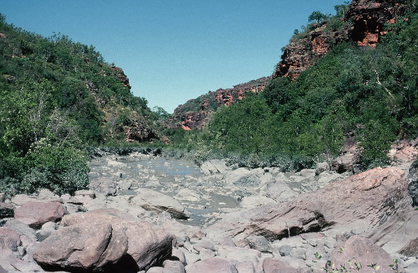 beauty never fails to impress me. Along the gorge the orange sandstone cliffs tower towards the sky, their rugged walls reflecting in the large pools below. Shaded by paperbark trees, the pools had banks laden with wild passionfruit and were home to many Johnson crocodiles and water monitors. From the top of Merton Falls, 200 metres north, we gazed at two freshwater crocs basking under