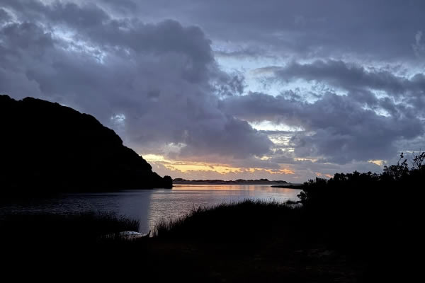 Leaving the Walcott Inlet camp we needed a 4.00am start to catch the tide and avoid trudging across too much mud. The moon filtering through the clouds gave us enough light to move around.