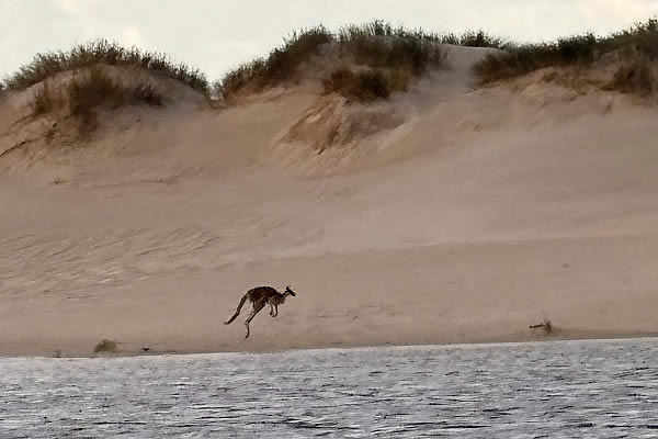 The next morning we walked out to the beach and was rewarded by seeing a kangaroo hopping along the sand before crossing through the water to the dunes. How cool.