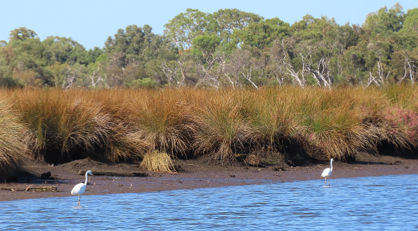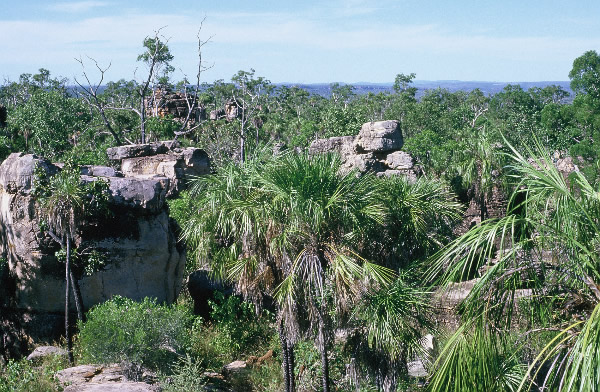 strapped to our front, which made seeing very difficult. We calculated them weighing around 40 kilograms and I only weighed 60 kilograms. Leaving the mullet to advance with the rising tide we stumbled away from camp and along the valley of huge paperbarks trees, lush vegetation, big boulders, and vines and spinifex hiding potholes full of water that we trampled in.