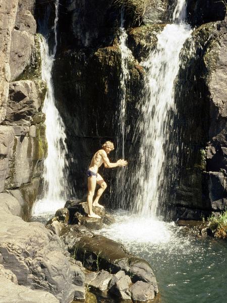 Leaving the tick infested cave we forged on for 2 more days to reach our ultimate goal the 29th March Cave. Along our route a gorge with pools, small cascades and a four metre waterfall, flanked on the left side by a vertical cliff that stood in our path. With ribs protruding, I posed for a photo in front of the picturesque falls. The days on