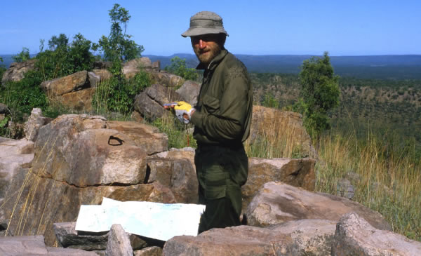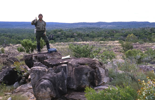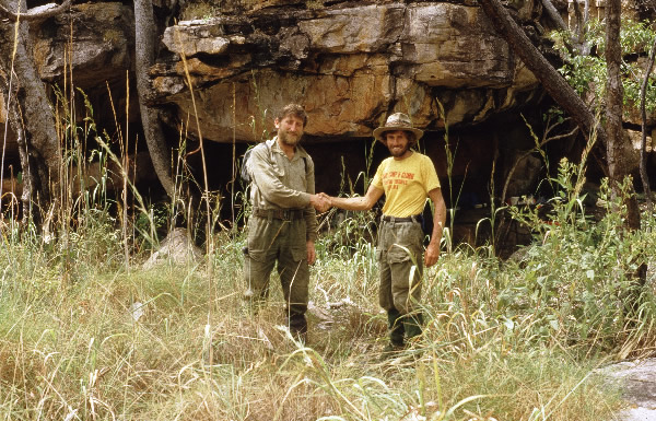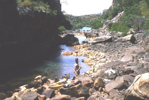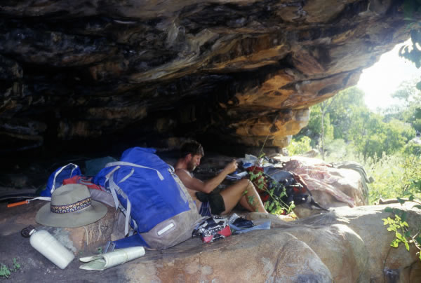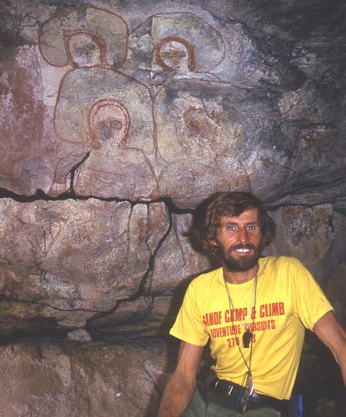 Celebrating 50 Years of Paddling Year 1987 Kimberley Kayak Expedition #4 cont..... For the next 2 days we followed Grey’s route from the river and arrived at the 26th March Cave, the first important cave that Grey had found. Grey described the cave…….. There appeared to be a natural hollow in the sandstone rocks; its floor elevated about five feet from the ground and numerous flat broken pieces of the same rock, which were scattered about, looked at a distance like steps leading up to the cave, which was thirty five feet wide at the entrance and