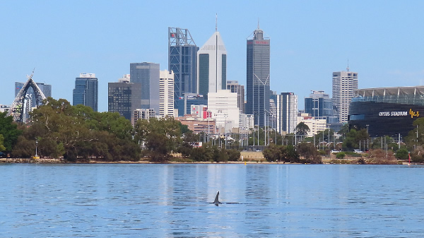 3 dolphins head towards the city.