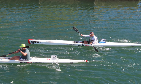 each other I felt that I could go faster so I decided to take off and tried to catch Sharon and Kate again. I caught them, but we came to the estuary crossing and split up. By now I was several metres ahead of Robin and I just couldn’t believe my luck. How did I manage to catch him!! As long I didn’t falter on the crossing, which had several power boats churning up the water, I had a good chance of beating him. When I entered the canals again with 1.2 kms to go to the finish line I was a happy chappy as after a glimpse or two over my shoulder I couldn’t see Robin directly behind me, but there was no way I was going to slow down and I didn’t so I managed to beat him by 48 seconds.