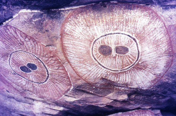 sixteen feet deep; but beyond this several small branches ran further back. Its height in front was rather more than eight feet, the roof being formed by a solid slab of sandstone about nine feet thick. Grey had discovered Aboriginal art never before seen by white man. Inside the cave Wandjina figures dominated the ceiling with other paintings, including a native carrying a