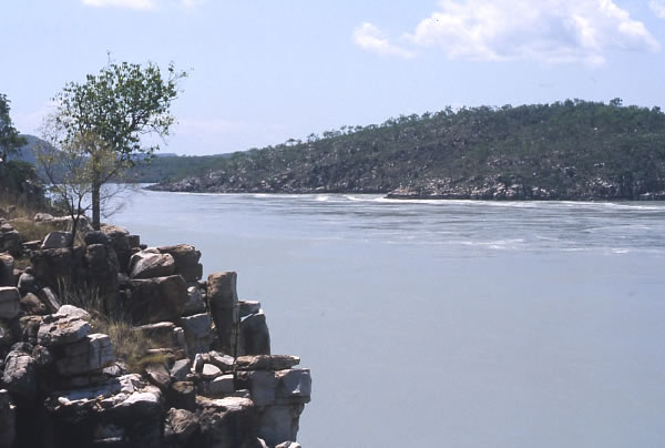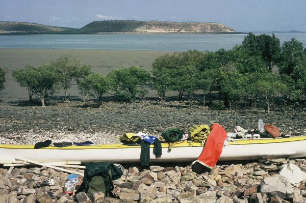 of a waterfall tried swimming to a tourist boat and was taken by a croc. This year it was nearly our turn! In the far distance our destination shimmered in the heat haze. Walcot Inlet, the home of the giant whirlpools was four hours away and with the previous stresses of the day it was going to be a hard paddle. As we approached the inlet we encountered driftwood, carried by the rising tide, which was hard to distinguish from crocodiles. Our campsite lay ahead. I pointed towards a boulder strewn beach partially hidden from view by extensive mangroves. Then we suddenly focused on a mangrove bough that jerked into the water ahead of us. “Oh no, we’re not going to camp here”, Ewen shouted. It looks too much like croc country. Looking west