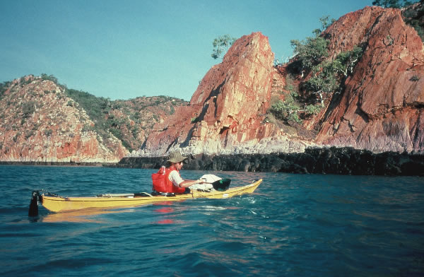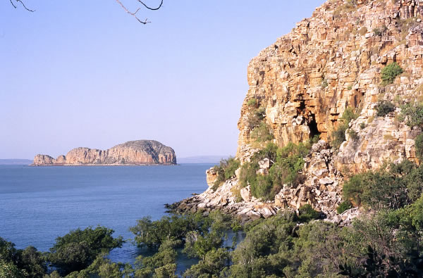 The pearling settlement of Kuri Bay was nestled at the bottom of a cove surrounded by spectacular cliffs. Boats and pearling pontoons were scattered around the cove and sleepy settlement, fronted by a thin line of mangroves, looked abandoned as we paddled across the glassy turquoise water towards it. Eagles soared on silent wings and it was only