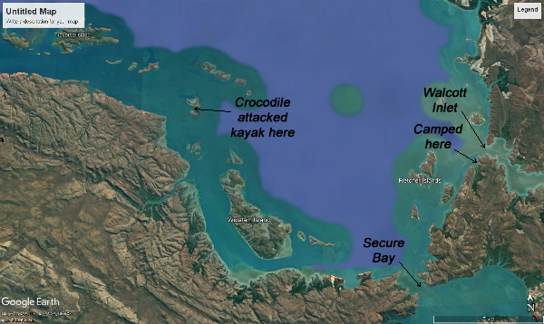 continually scanned the water behind expecting the croc to attack again. Minutes seemed like hours. I still had the thoughts, would the croc attack me next? After paddling 2 kilometres out into the open sea, Ewen finally allowed me to catch up with him. He was badly shaken so I tried to turn our frightening experience into a light hearted joke as we still had 3 weeks and 500 kilometres
