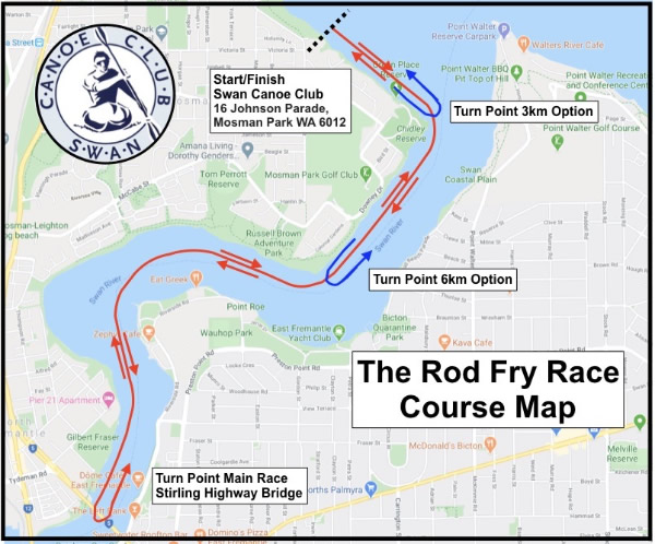 hydration, sun protection. PFD for under 16 not compulsory with parent permission. All participants must attend the Race/Safety Briefing at 8am. COURSES [Link to race map] Start/Finish at Swan Canoe Club jetty. 12km (turn at Stirling Bridge, North Freo) 6km (turn at Point Roe red marker) 3km (turn at Chidley Point red marker) All turns are anticlockwise. Wave starts from 8:30am. Waves/Classes to be confirmed on race day. Race Director has discretion. Dragon Boats: 6km only PRIZES Cash prizes for fastest male and female single paddlers (12km course): 1st: $150. 2nd: $100. 3rd: $50. Plus random draw for other prizes. Presentations after the race. FEES Adults: $35 Juniors (U18): $20 Morning tea and refreshments are included in the race entry fee – available at the club after the race. $20 for insurance will be added for non-affiliated paddlers ENQUIRIES: admin@swancanoeclub.org.au TO REGISTER: https://www.webscorer.com/register?raceid=421720